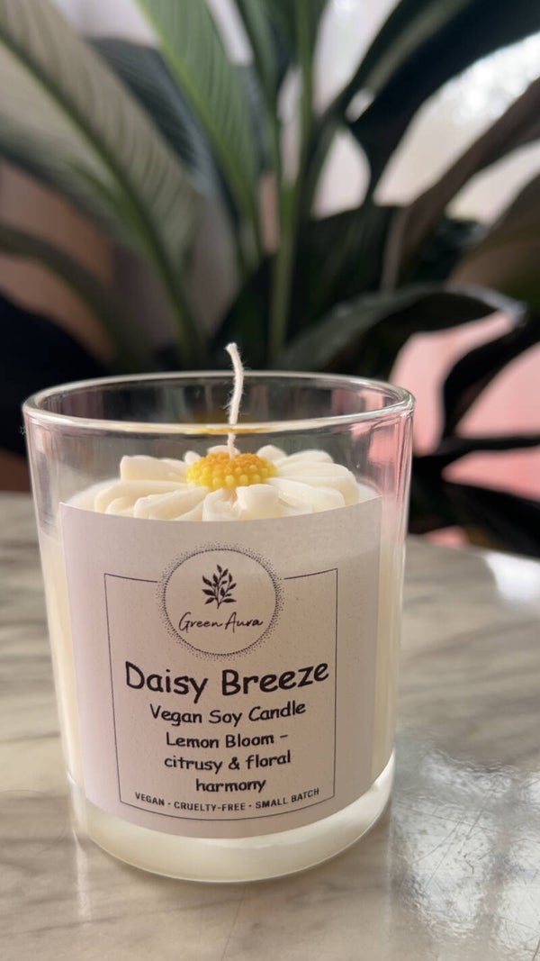 Bring light, elegance, and gentle energy into your home with the Daisy Breeze Soy Candle — a hand-poured soy candle topped with a delicately sculpted daisy flower made entirely from wax. Thoughtfully designed to look beautiful and burn cleanly, it’s both a calming presence and a decorative statement.